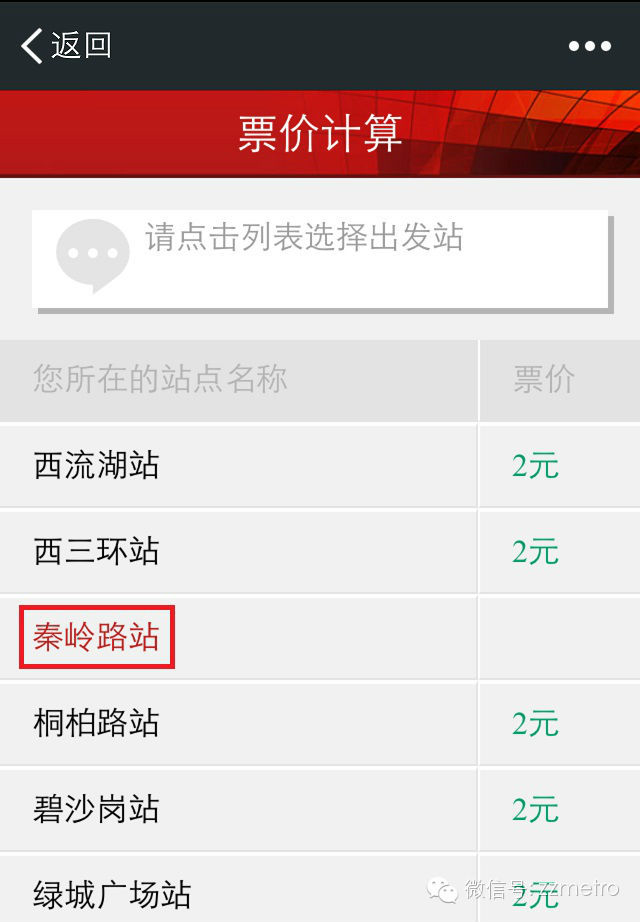 打開【地鐵出行】菜單【票價(jià)計(jì)算】。選擇起點(diǎn)站,所需票價(jià)自動顯示。