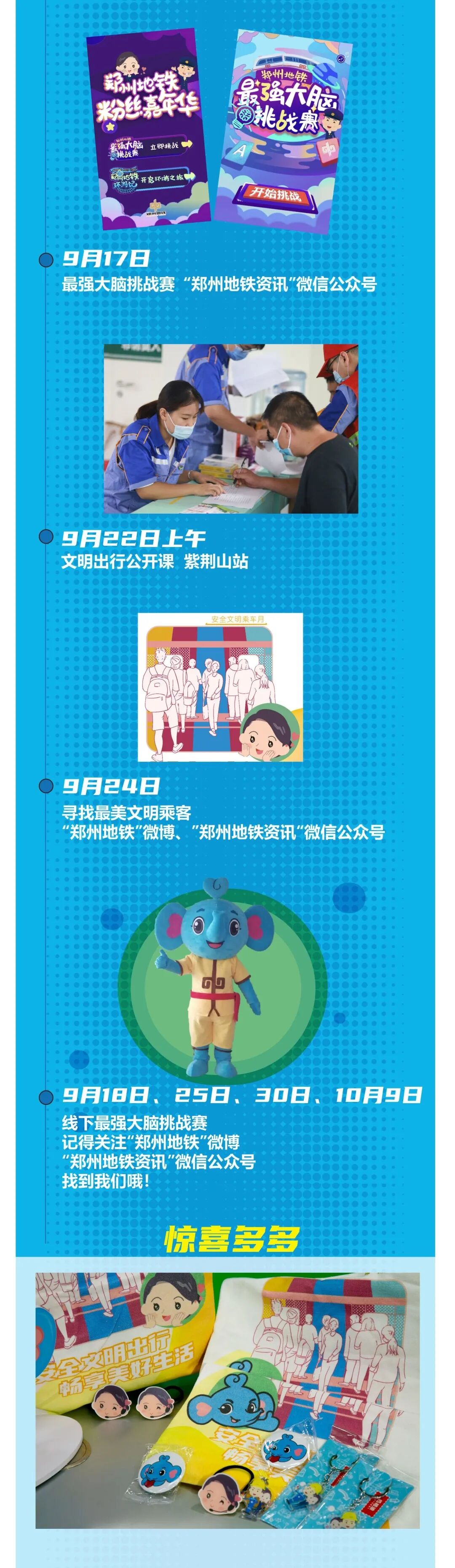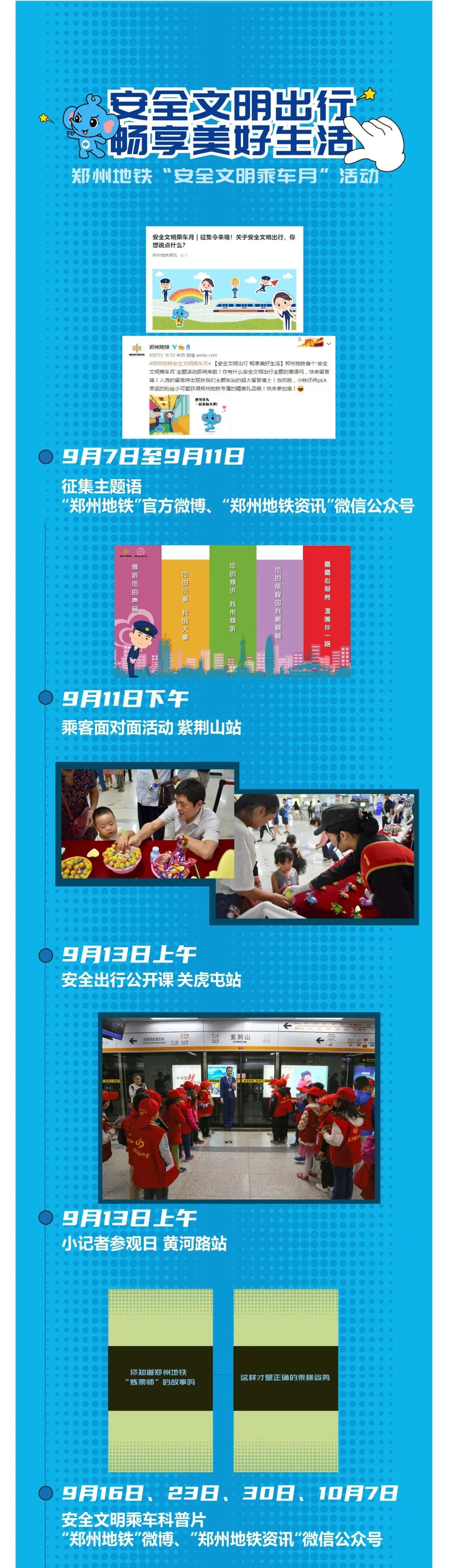 為使乘客積極參與“安全文明乘車月”活動,鄭州地鐵還將舉辦各類線上線下活動,包括征集主題語、安全文明答題挑戰(zhàn)、小記者開放日、安全文明乘車公開課、尋找最美文明乘客、乘客面對面等,積極參與的乘客有機(jī)會贏取鄭州地鐵定制的精美禮品。