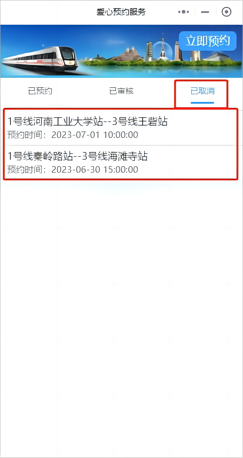 2.預約信息提交成功后,可在“鄭州地鐵服務”小程序首頁“已預約”中查看預約情況;工作人員審核通過后,將在“已審核”中進行展示,您可按照預約時間到達預約車站乘車;如您行程有變化,可操作“取消預約”,并可在“已取消”中查看取消預約記錄。