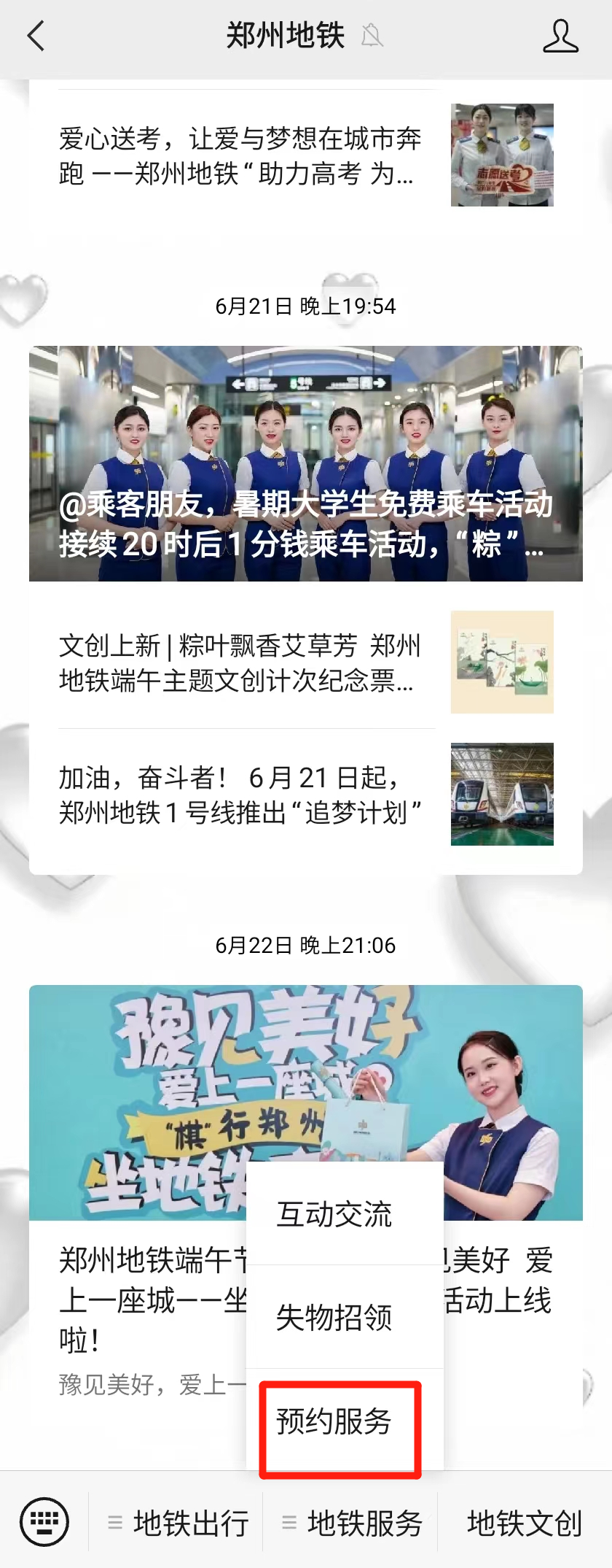 1.打開微信“鄭州地鐵”公眾號,選擇“地鐵服務”-“預約服務”。