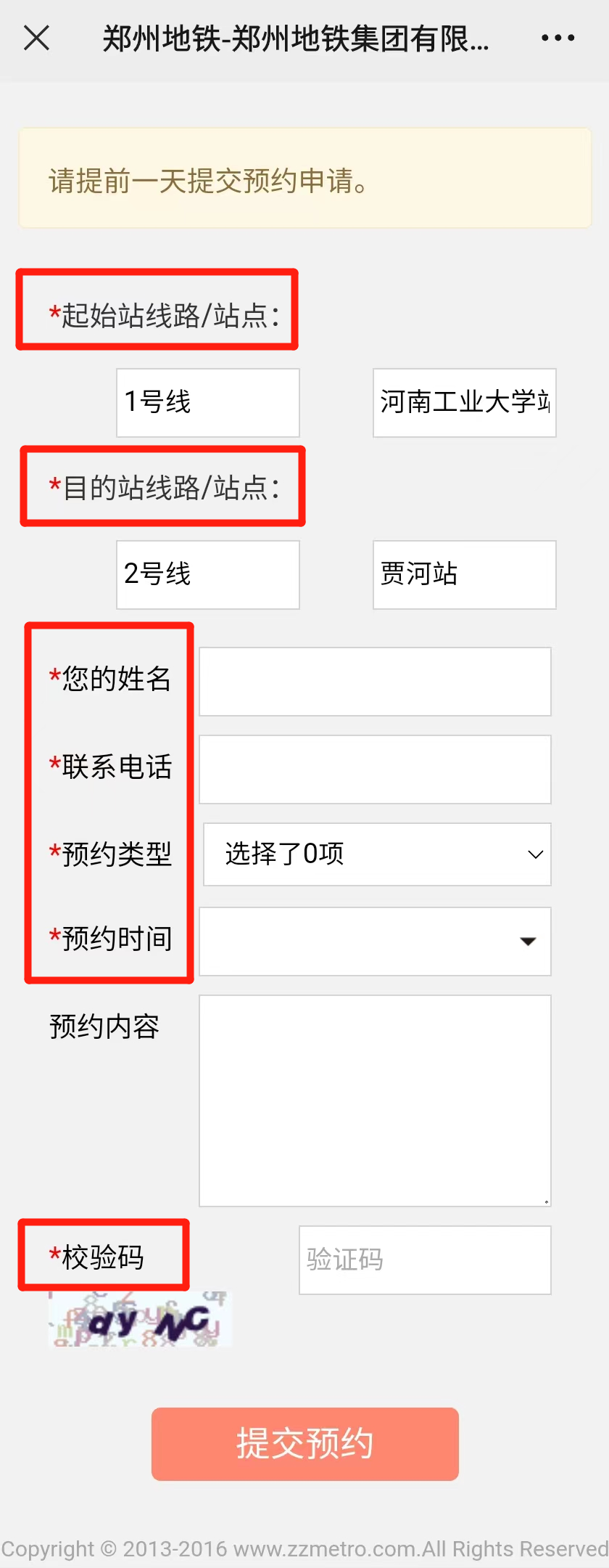 2.完善帶“*”的信息,如:進出站點、您的姓名、聯(lián)系電話、預約類型及預約時間;如您有需要車站人員提供的特殊幫助,可在“預約內(nèi)容”中補充完善,并點擊“提交預約”。