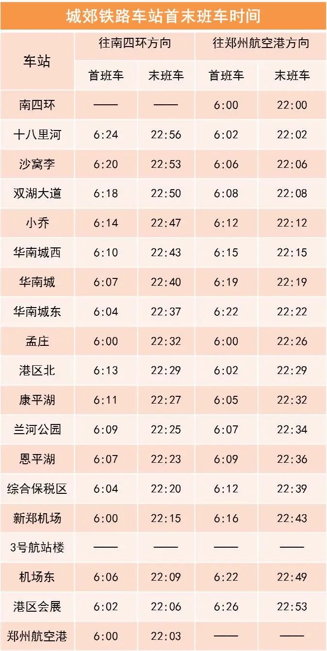 兩座車站開通后,城郊鐵路各站首末班車時間如下。請您及時關(guān)注鄭州地鐵運營服務(wù)網(wǎng)站或車站首末班車時間牌,合理安排乘車時間。