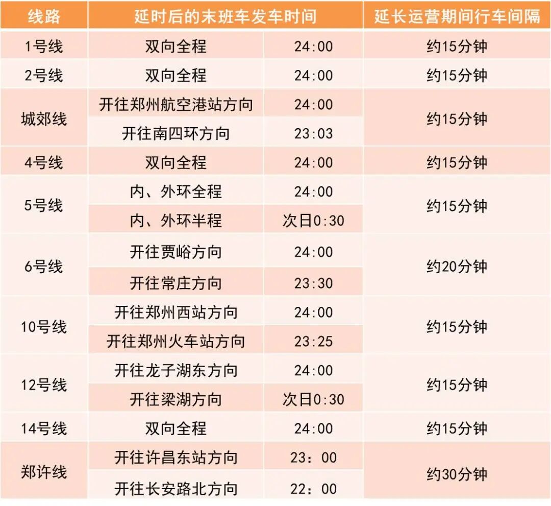 鄭州地鐵結(jié)合線網(wǎng)客流特點(diǎn),節(jié)前一天及元旦假期(12月29日~1月1日),地鐵線網(wǎng)總體延長(zhǎng)至次日0:00,延長(zhǎng)期間行車間隔約15至30分鐘。具體詳見下圖: