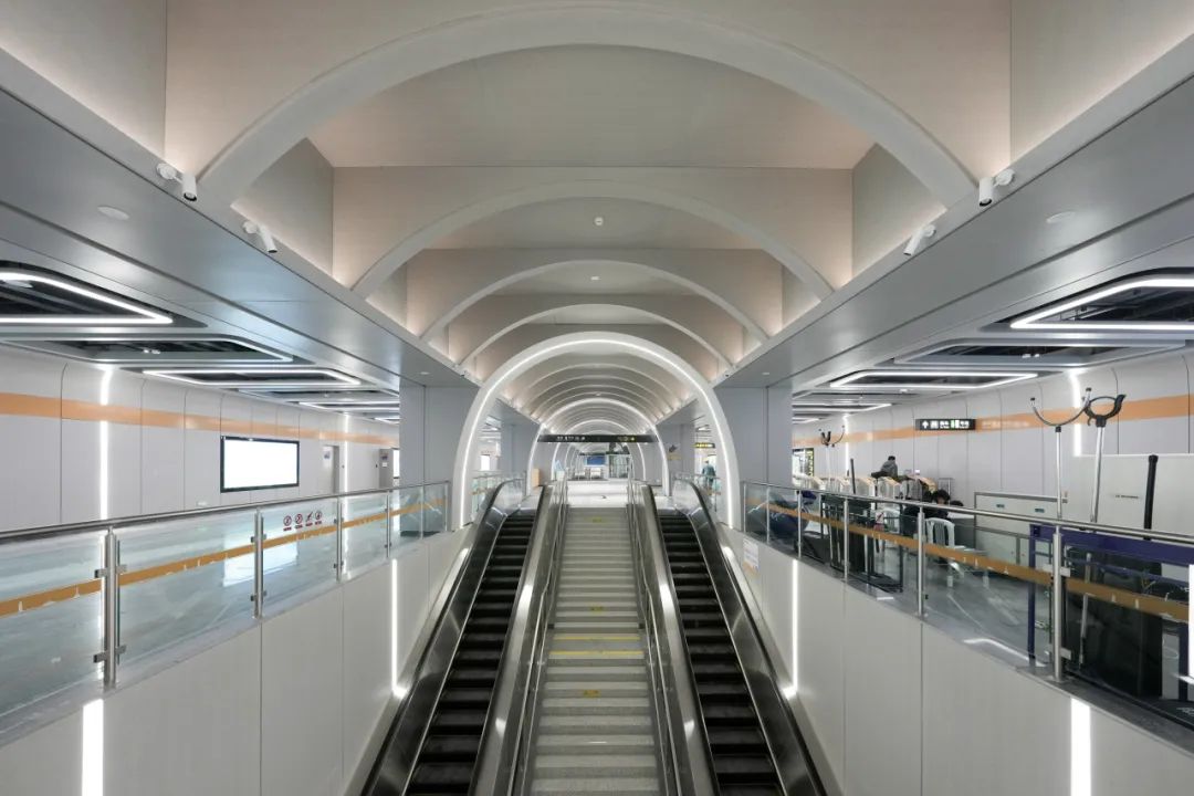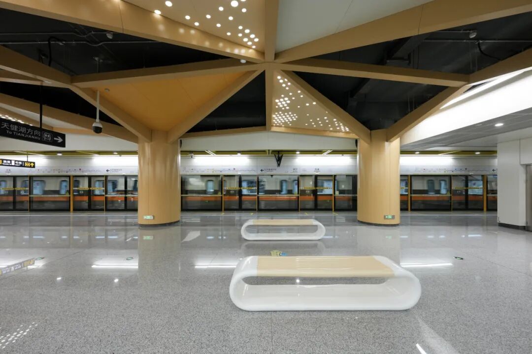 全線采用空間藝術(shù)一體化的設(shè)計理念,實現(xiàn)空間功能的優(yōu)化和藝術(shù)表達的和諧統(tǒng)一。大學(xué)中路站運用空間一體化設(shè)計手法,使天花、墻面、地面色調(diào)相得益彰,通過突出的導(dǎo)視設(shè)計增加空間的趣味性。市第二人民醫(yī)院站強調(diào)空間的序列感,運用簡單幾何拱形元素,融入藝術(shù)燈光設(shè)計,營造舒適的地下光環(huán)境空間。