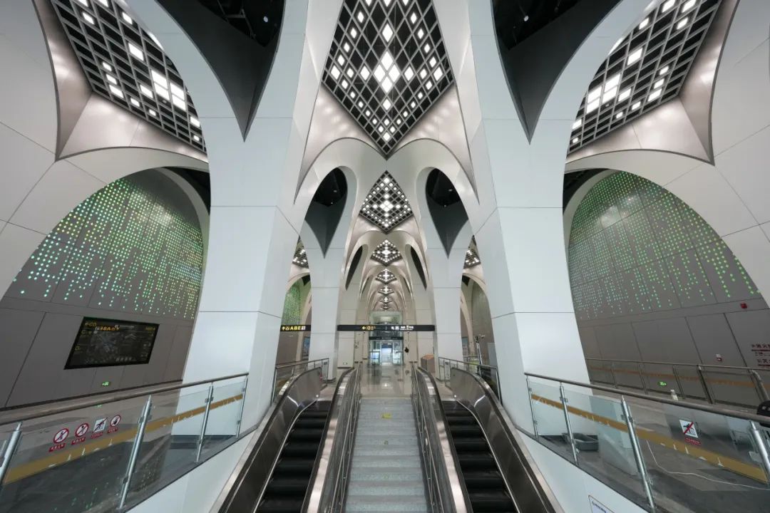 全線以“炫彩鄭州·筑夢未來”為設(shè)計主題,通過動感時尚的色彩和變化的空間構(gòu)成語言,以及半裸空間設(shè)計方式,呈現(xiàn)了一個現(xiàn)代、青春、動感、時尚的形象。鄭州大學(xué)站以“炫彩·未來”為設(shè)計主題,通過車站空間色彩、線條、科技星空等設(shè)計手法的運用,營造出鄭州城市科教發(fā)展的未來美好景象。白廟站以“現(xiàn)代·騰飛”為設(shè)計主題,利用科技感十足的鉆石切割面為空間的基本構(gòu)型,通過色彩、燈光、形體、構(gòu)成等,展現(xiàn)鄭州城市騰飛、科技發(fā)展的新城市面貌。