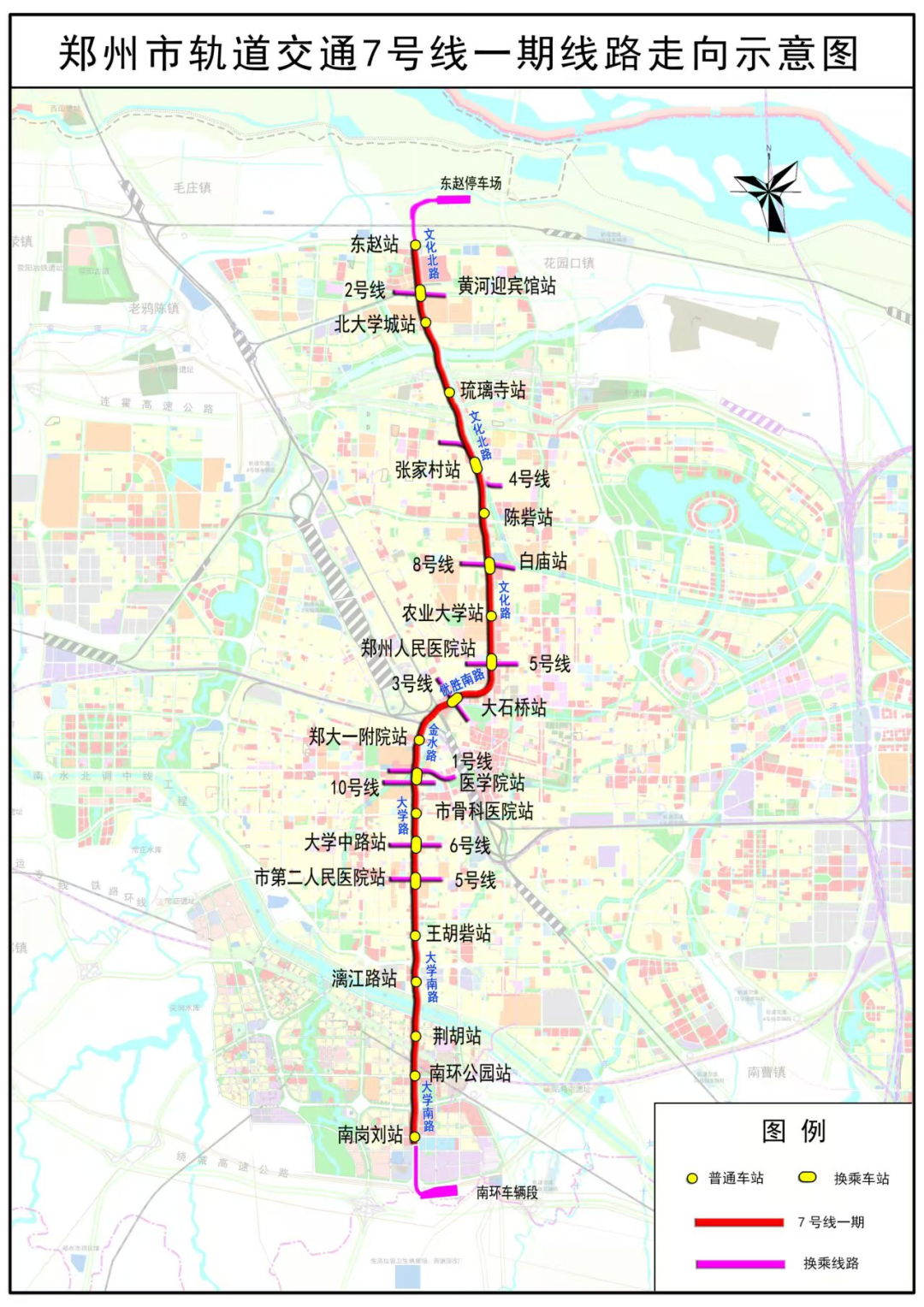 7號線一期是鄭州市中心城區(qū)的一條南北向加密線,起于南崗劉站,止于東趙站,線路全長26.8公里,設(shè)車站20座,其中換乘站8座,它串聯(lián)起黃河片區(qū)、老城片區(qū)、南部片區(qū)和南部新城,沿線經(jīng)鄭州最早的幾所大中專院校、初高中等多家文化教育機構(gòu),是可追溯、可尋根的“文脈記憶線”。