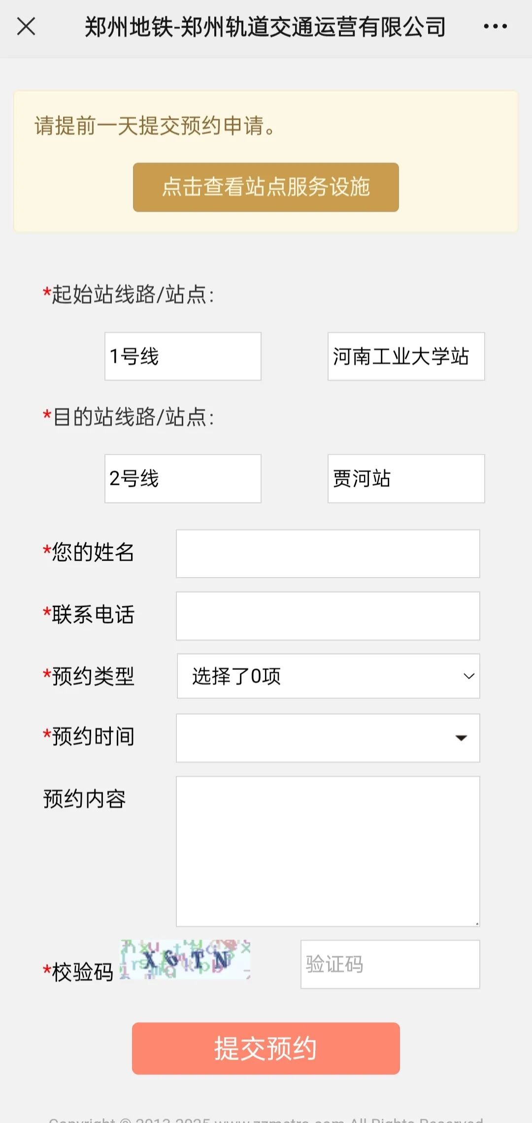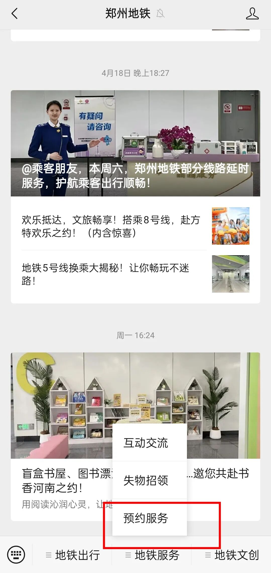 1. 公眾號預(yù)約。請?zhí)崆?4小時通過微信公眾號預(yù)約,預(yù)約路徑:“鄭州地鐵”公眾號——地鐵服務(wù)——預(yù)約服務(wù)。