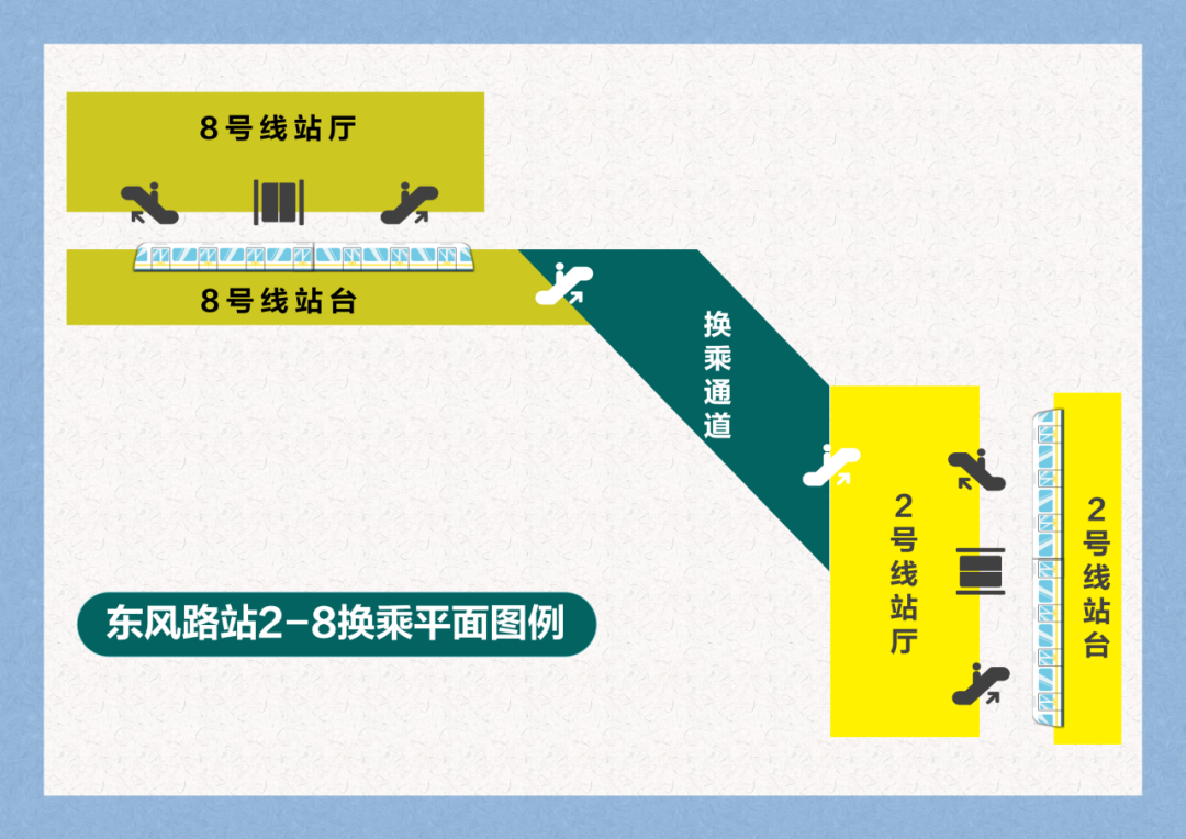 東風(fēng)路站位于東風(fēng)路與花園路交叉口,為地鐵2號線、8號線換乘站,換乘方式為通道換乘,換乘通道全長約180米,換乘通道連接8號線站臺和2號線站廳。小編在這里為您附上換乘示意圖,方便您查看: