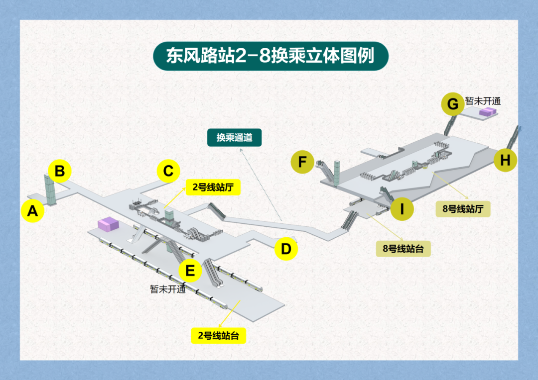 溫馨提示:東風(fēng)路站目前共開通7個出入口,其中2號線開通的4個出入口分別為A口、B口、C口、D口,8號線開通的3個出入口分別為F口、H口、I口。因東風(fēng)路站非付費區(qū)不連通,前往A口、B口、C口、D口的乘客需先到達2號線區(qū)域,前往F口、H口、I口的乘客需先到達8號線區(qū)域,掌握以上信息,避免繞路哦!