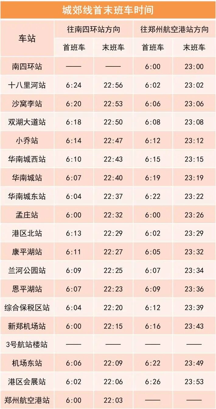 10號線一期鄭州火車站開往鄭州西站方向末班車時間由22:35延長至23:00;鄭州西站開往鄭州火車站方向末班車時間由22:00延長至22:25,延長運營期間行車間隔約10分鐘。